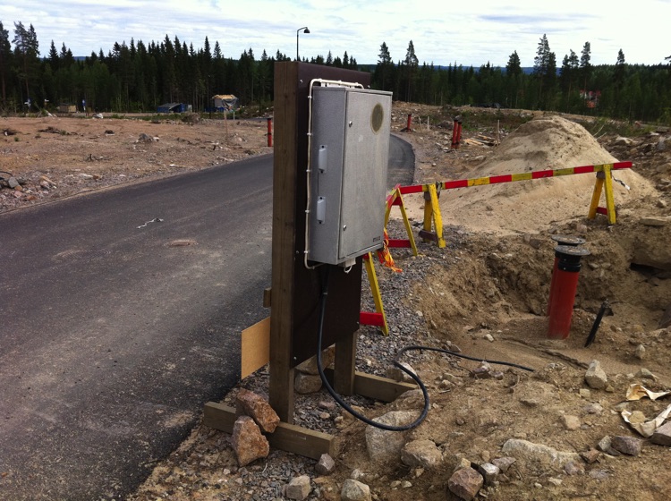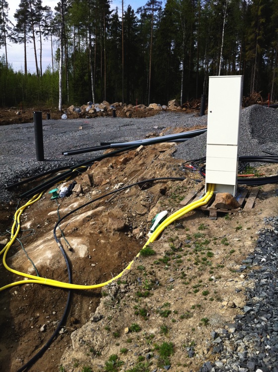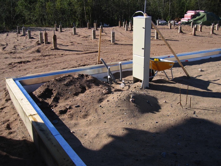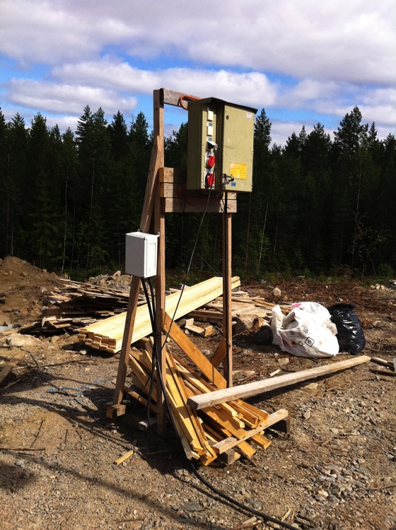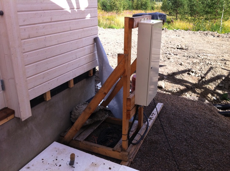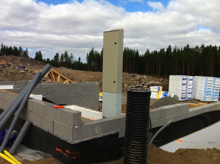 Työmaa tarvitsee sähköä jo melko pian, joten sitä varten asennetaan mittauskeskus sähköliittymään. Jos se on mahdollista sijoittaa lopulliseen paikkaansa, niin asennusta ei tarvitse purkaa sitten, kun talo valmistuu. Yleensä mittauskeskus kuitenkin asennetaan väliaikaiseen telineeseen lähelle lopullista sijoituspaikkaa.