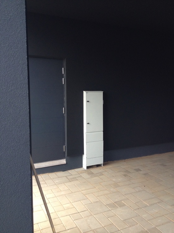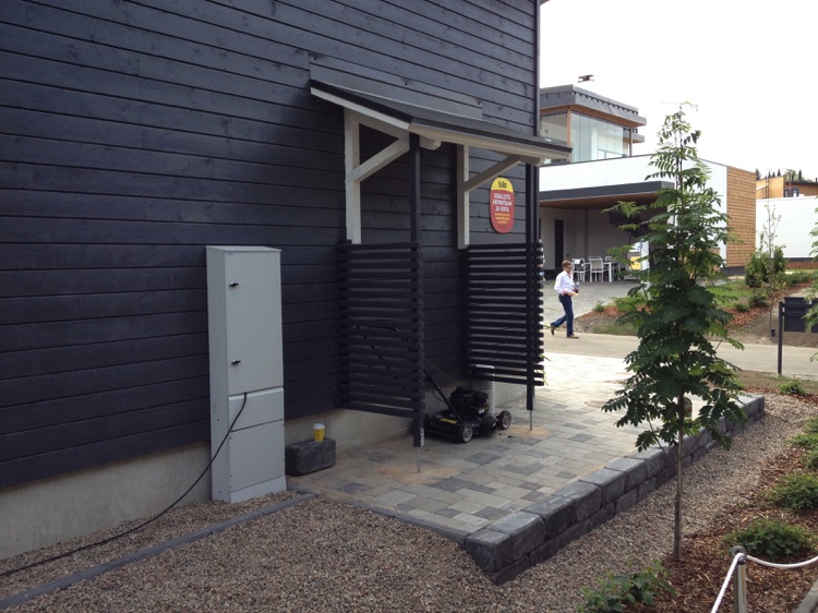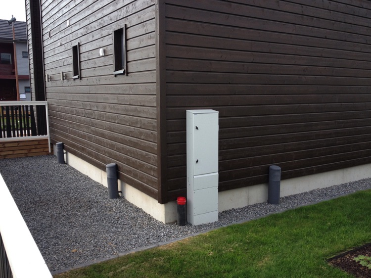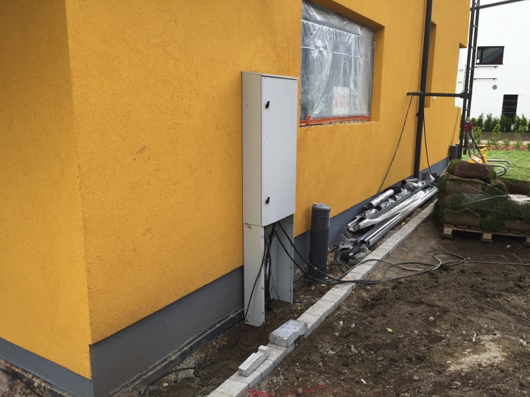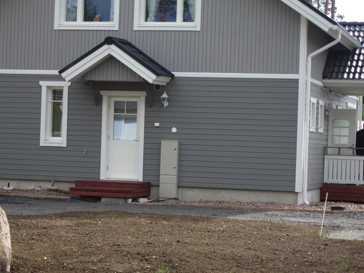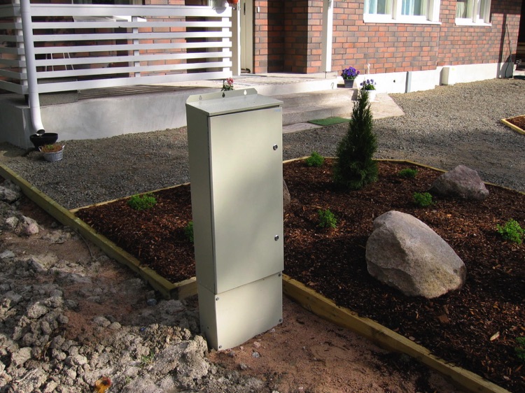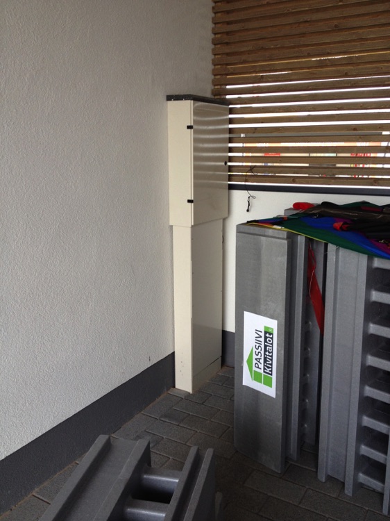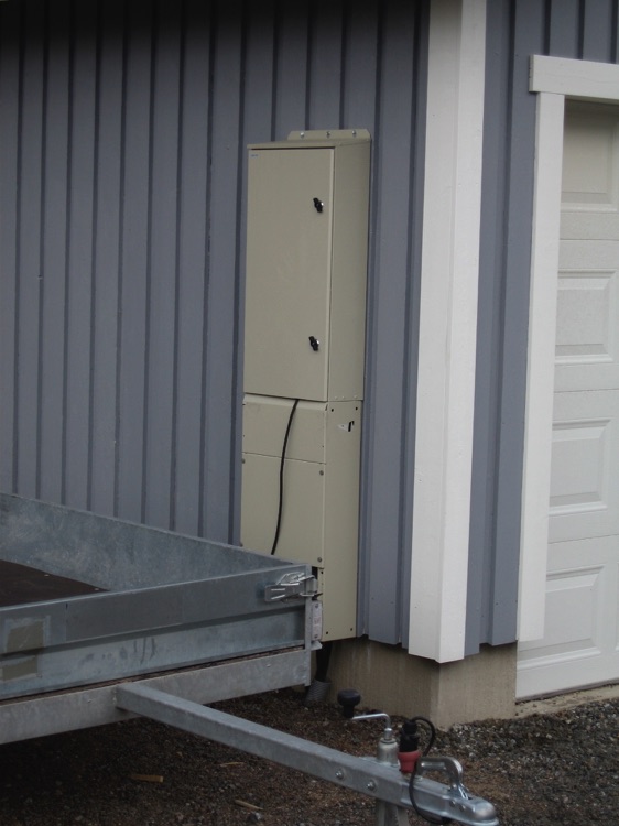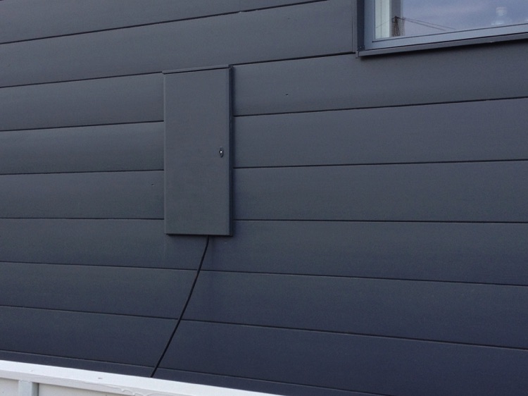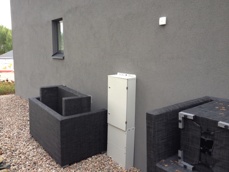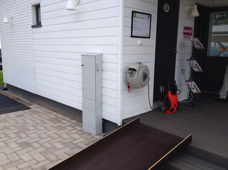 Autokatoksen perukalla ulkoseinällä. Kaapelit piilossa kotelon suojassa.